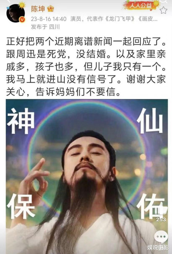 陈坤在2023年就辟谣了,表示和周迅只是死党,没结婚。家里亲戚多孩子也多,但儿子只有一个。这辟谣已经很明白了,但狗仔还是不放过,其实已经辟谣了,不可能还会再声明。其实应该娱乐圈的秘密很多,不是一般人能够知晓,或许多年后有些秘密才浮出水面,毕竟有些体面要维护,有些羞愧要遮掩。