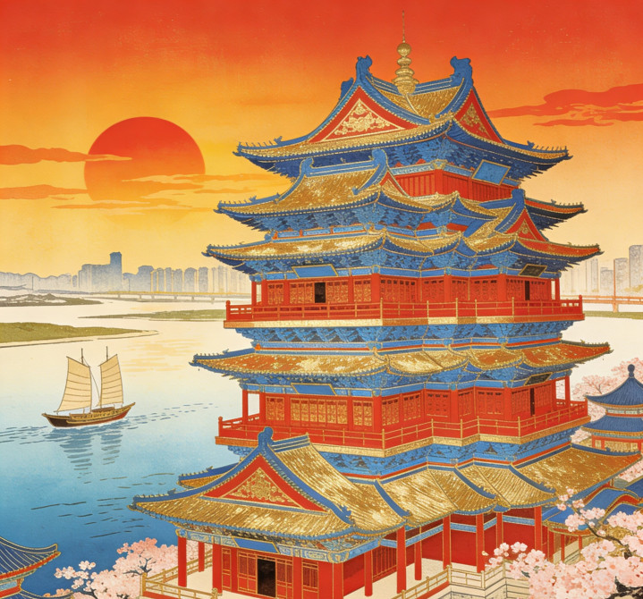 3. 情感内涵:这四句不仅是对滕王阁周边环境与建筑的客观描写,更蕴含了作者的审美追求。作者通过对自然景致的细致描摹和对建筑的赞美,表达了对江南山水与中式建筑美学的热爱。同时,“即冈峦之体势”所体现的顺应自然的理念,也暗含了古人“天人合一”的哲学思想,为后文的抒怀埋下伏笔。