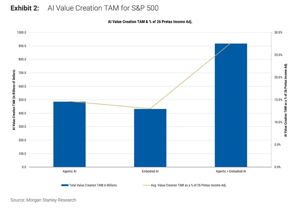 大摩策略师门估计,人工智能智能体(Agentic AI,即能够在比生成型人工智能更少的监督下做出决策和行动的人工智能)可能贡献约4900亿美元的价值,而具身型人工智能(embodied AI,即类人机器人)可能贡献约4300亿美元的价值。